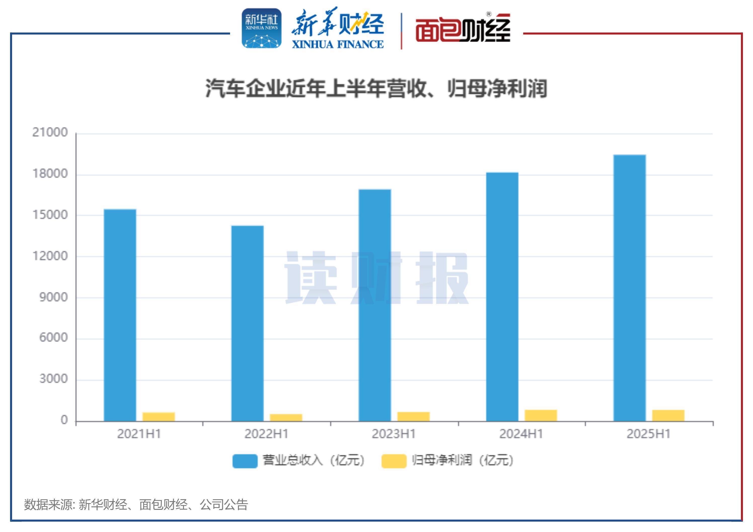 新华财经和面包财经研究员梳理公开资料显示,A股申万一级行业分类为汽车的229家企业2025年上半年合计实现营收1.94万亿元、归母净利润809.63亿元,同比分别变动7.07%、-0.78%。
